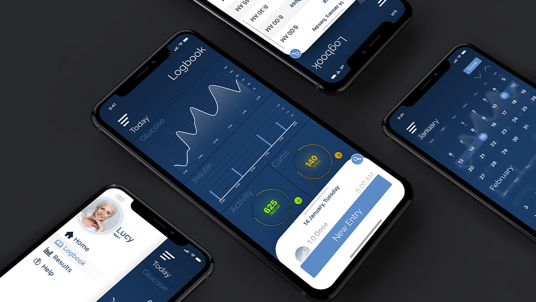 Design exercise of the logbook screens for an app to handle logging of glucose, insulin, carbohydrates, exercise, etc. to be visually appealing and user friendly as well as accompanying print materials.